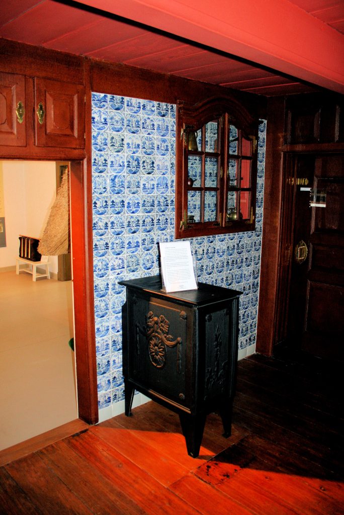 Döns – die Wohnstube – stammt aus dem Wendtschen Hof und befand sich links vom Vordereingang. Obwohl die Bauern in der Störniederung aufgrund der weniger ertragreichen Mischböden nicht so wohlhabend waren wie ihre Nachbarn in der Kremper- und Wilstermarsch, ermöglichte die ansteigende Agrarkonjunktur um 1800 doch einen gewissen Lebensstandard. Davon zeugt die Döns aus der Störniederung, einer bislang kaum erforschten Kulturlandschaft. Es gibt hier zwar keine aufwendigen Schnitzereien und Ausmalungen wie andernorts, doch die Fliesenwand mit den biblischen Motiven, die feinen Messingbeschläge und die in die Wand eingelassene Uhr sind kunsthandwerklich von hoher Qualität. Ein wahres Prachtstück ist der Eckschapp, der Schrank in der Ecke. Mit seinen figürlichen Schnitzereien und architektonischen Zierelementen steht er im deutlichen Kontrast zu den schlichten Wandpaneelen. Hier findet sich das Datum 1794, das die Entstehungszeit der Döns um 1800 belegt.