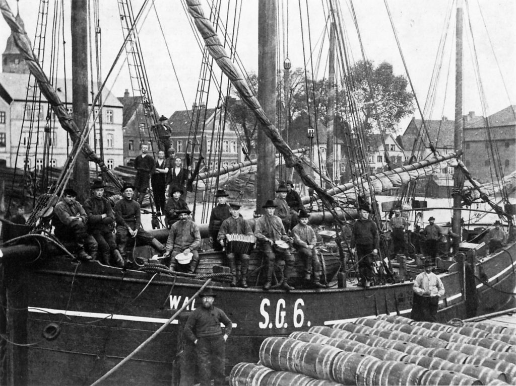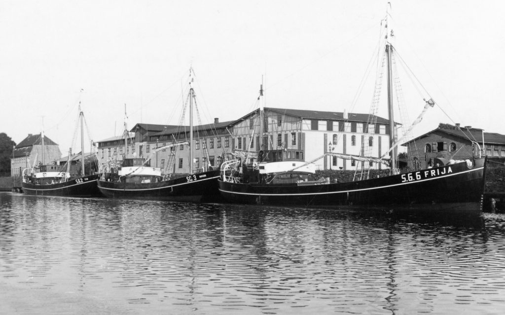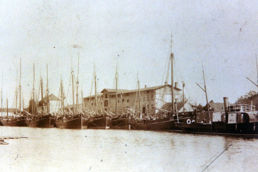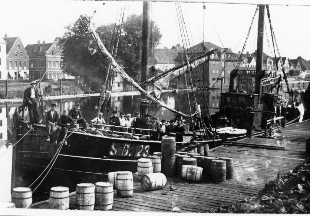 Im Vordergrund zusehen u.a. der von den Nationalsozialisten subventionierte eiserne Motorlogger Frija. Gebaut 1934 auf der Neptunwerft in Rostock. Im Hintergrund die „Alte Admiralität“.