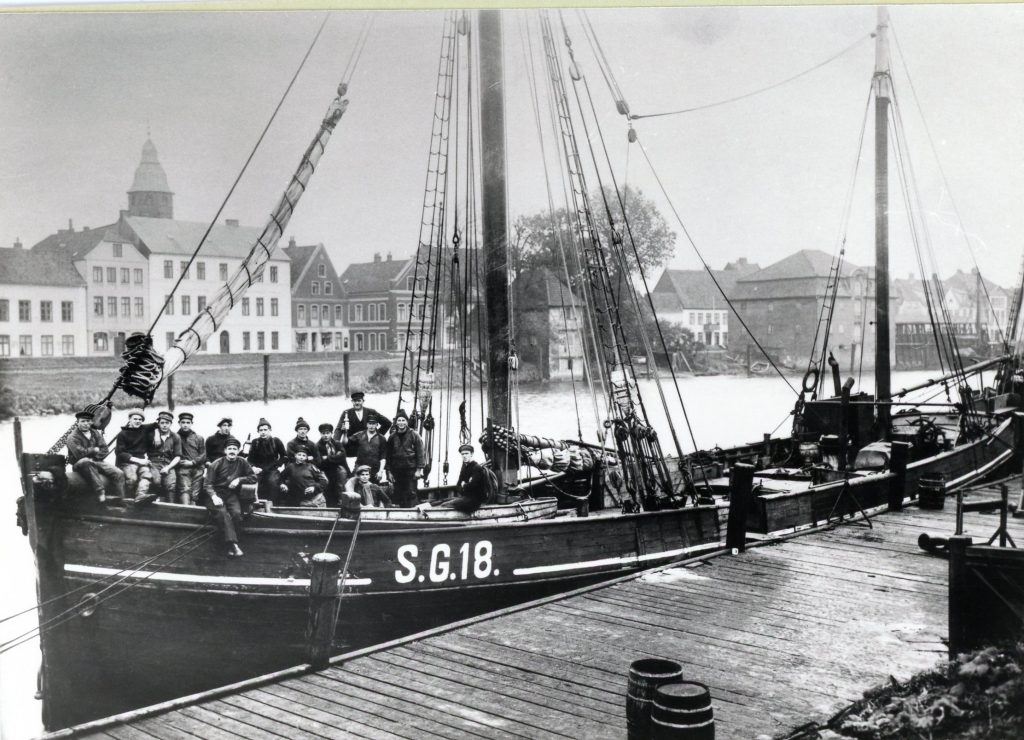 Das ehemalige Palais des Glückstädter Flottenkommandanten, die sog. Alte Admiralität, um 1900 mit den ersten Glückstädter Segelloggern davor.