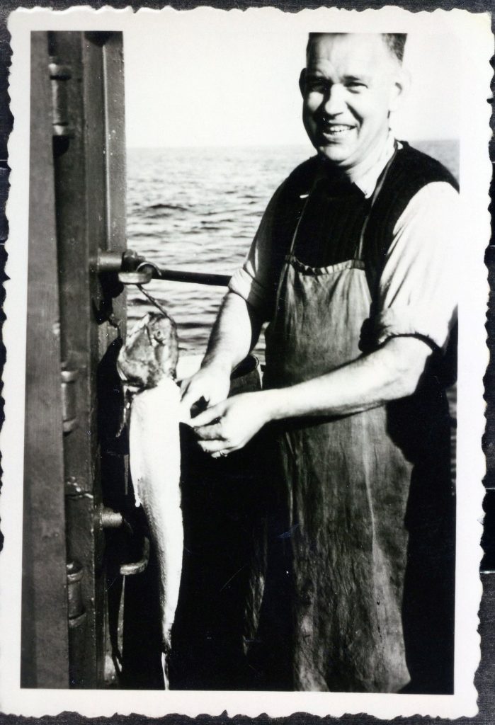 Der Koch der Saxnot. Er müsste auch mit anpacken, wenn der Fang eingeholt wurde und die Netze danach verstaut werden mussten.