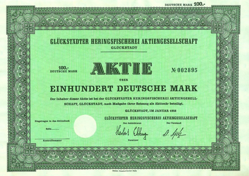 Eine Aktie der Glückstädter Heringsfischerei aus dem Jahr 1958.