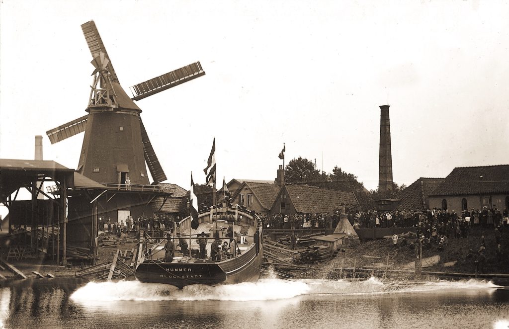 Der hölzerne Segellogger Hummer (SG 16) läuft 1904 bei der Glückstädter Werft Gehlsen vom Stapel.